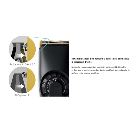 • Brivna glava: X-taper Blade 2.0, karbonska vlakna/titan, 7-smerna nastavljivost od 0,8 mm do 2,0 mm