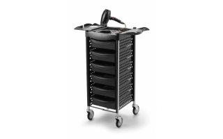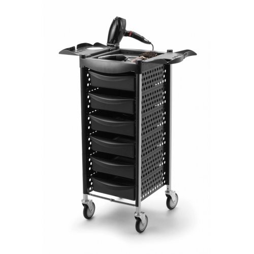 • črn voziček za frizerske pripomočke s 6 predali in visoko kvalitetnimi gumijastimi koleščki